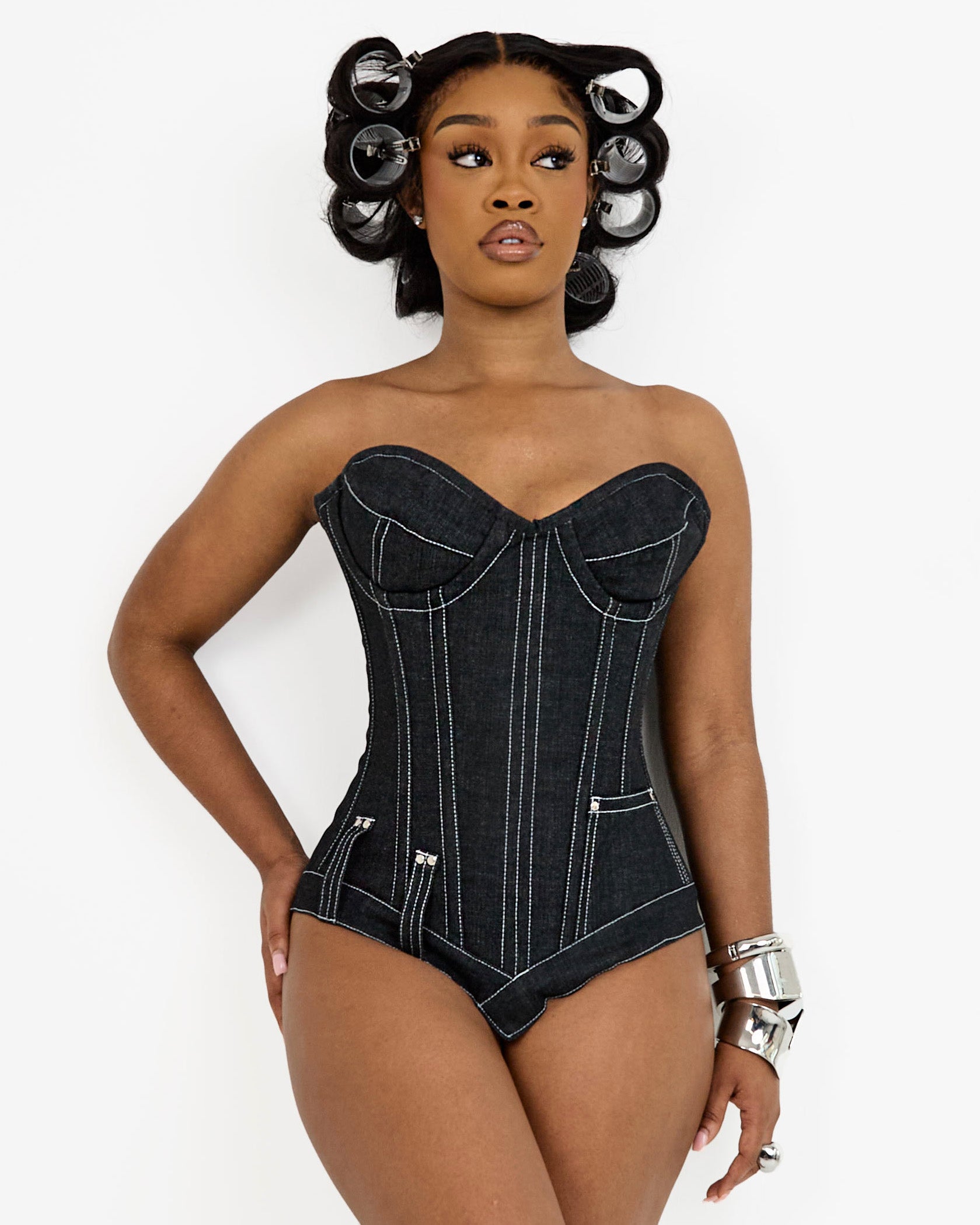 Reimagine casual with Denim Diva, a corset that doesn't play by the rules. Crafted from structured denim with crisp contrast stitching, she features a flattering curved hem, bust-enhancing cup seams, and a functional zip pocket that adds a playful twist. This is denim, redefined.
